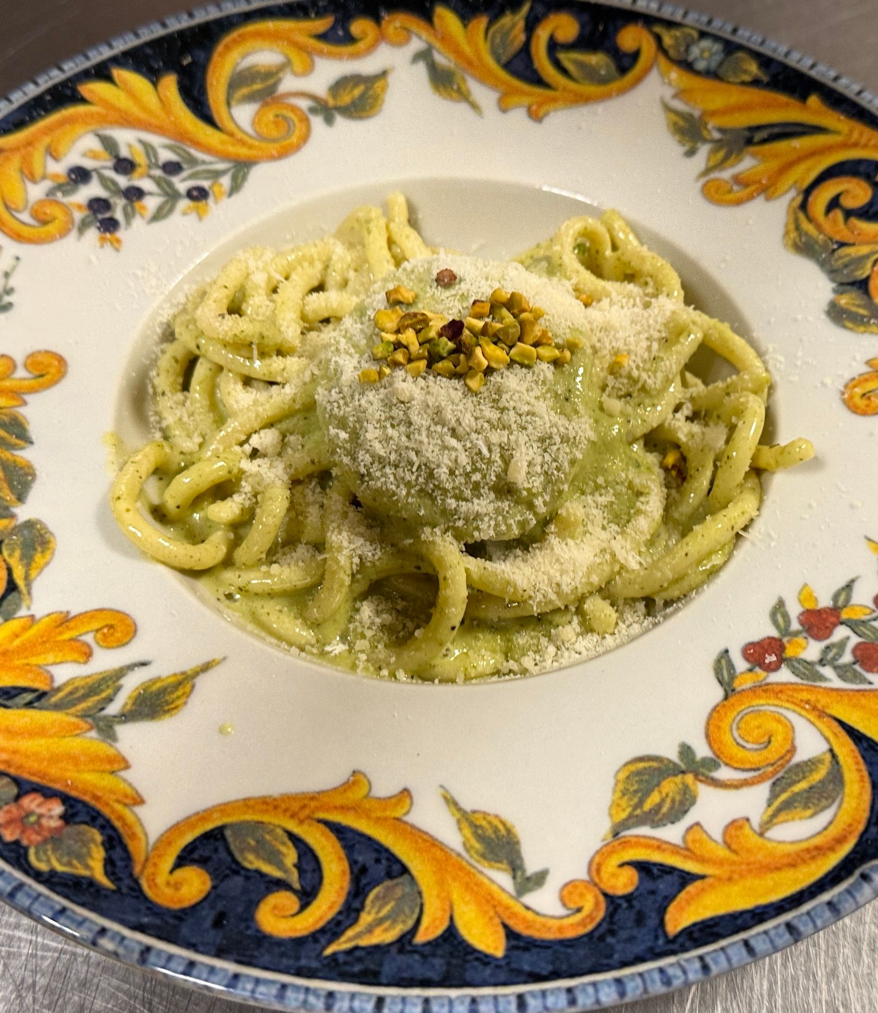 Makaron RIGATONI z burratą i pesto w sosie ostrym pomidorowym