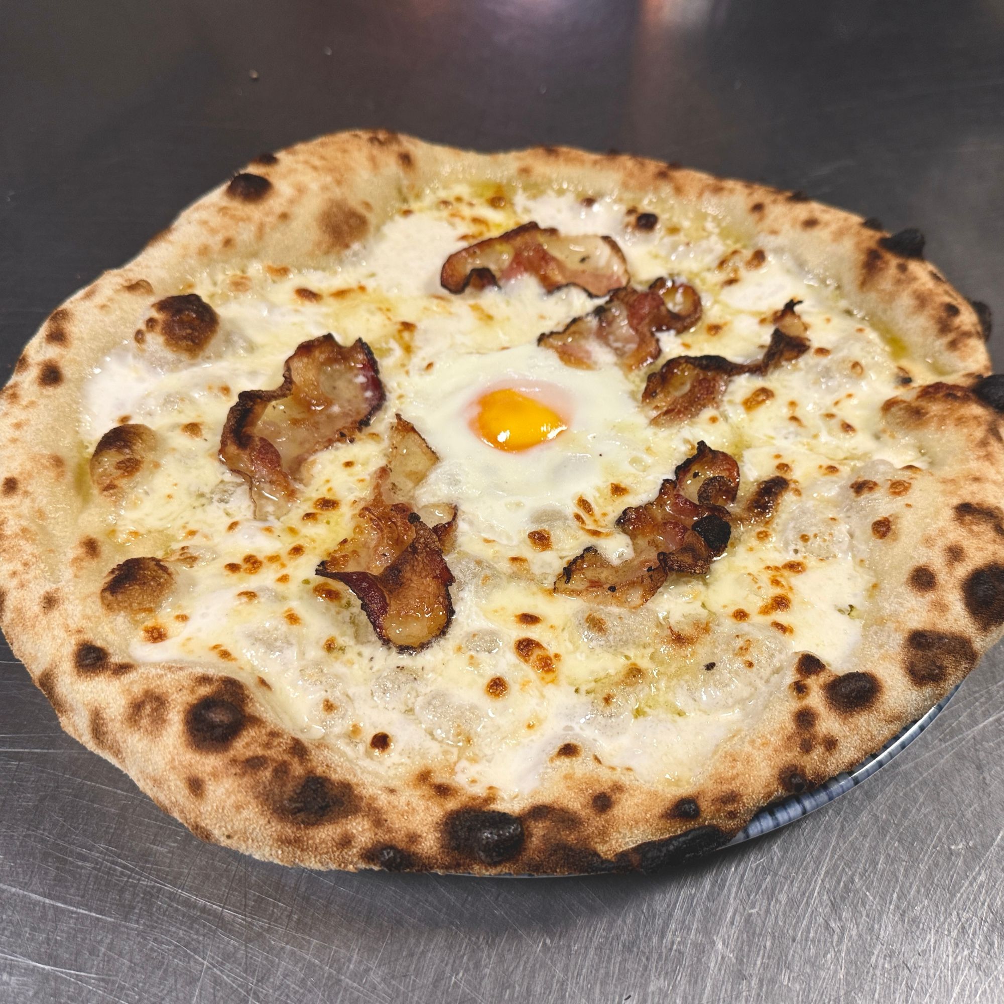 Kremowa bianca, grzyby, pancetta, hot honey, burrata na finiszu.